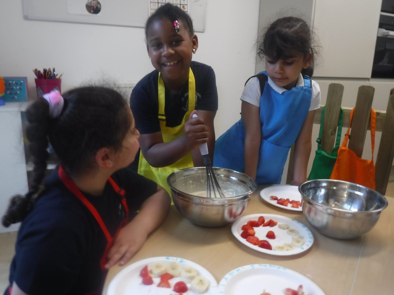 Children from years 1-3 at St Johns have been taking part in weekly after school cooking lessons. The children in the group have been focusing on developing and extending their cooking skills week on week. We have also supported the children to work together co-operatively as a kitchen team to produce a range of baked goods which they were then able to share with their families. To celebrate the end of the sessions we made healthy American pancakes with grated apple and fruit toppings.